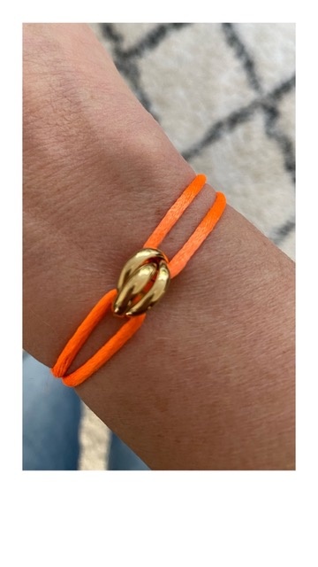 Armband met stainless steel ringen aan een fel oranje satijnkoord. De armband is in maat verstelbaar.