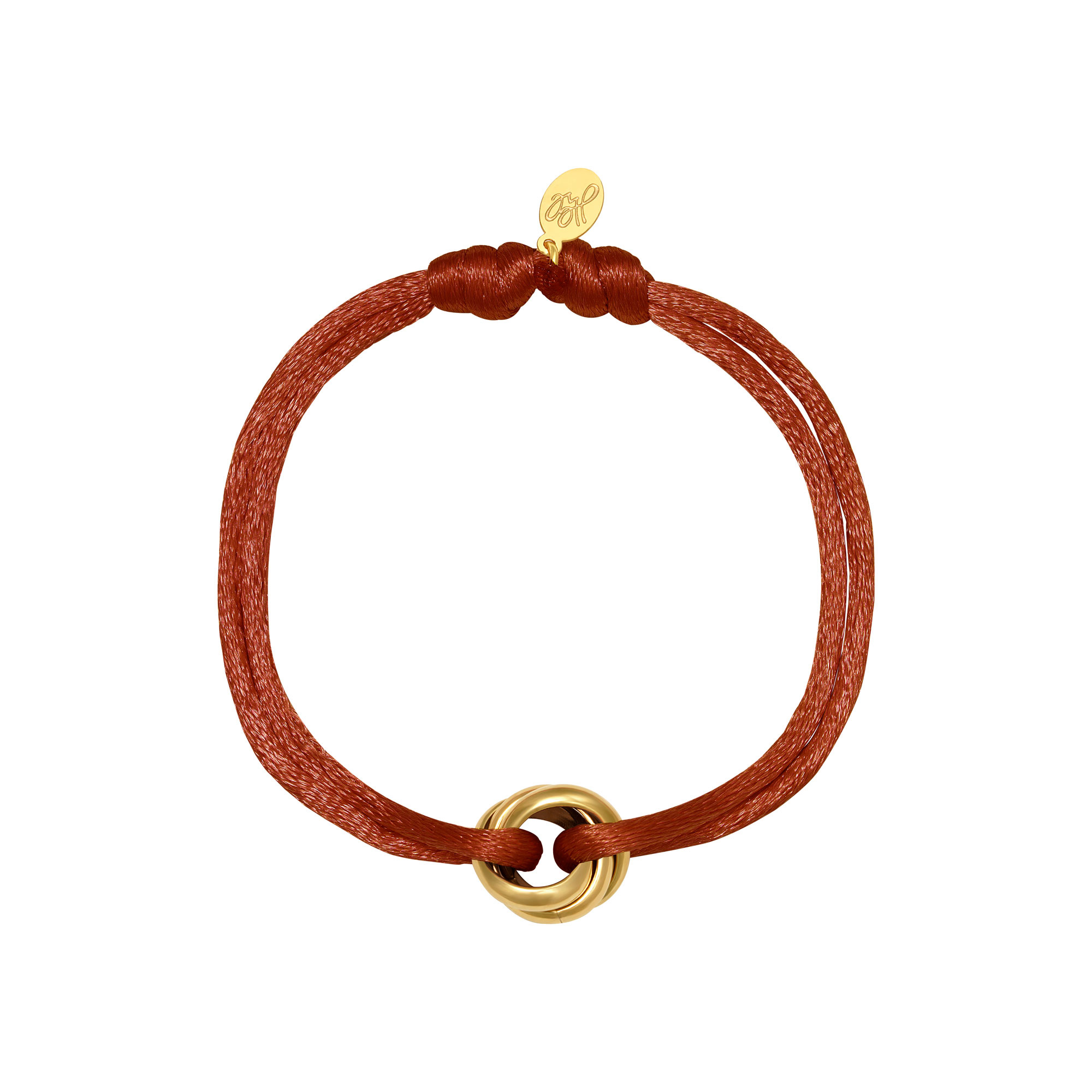 Armband van terra satijnkoord met goudkleurige stainless steel ringen.